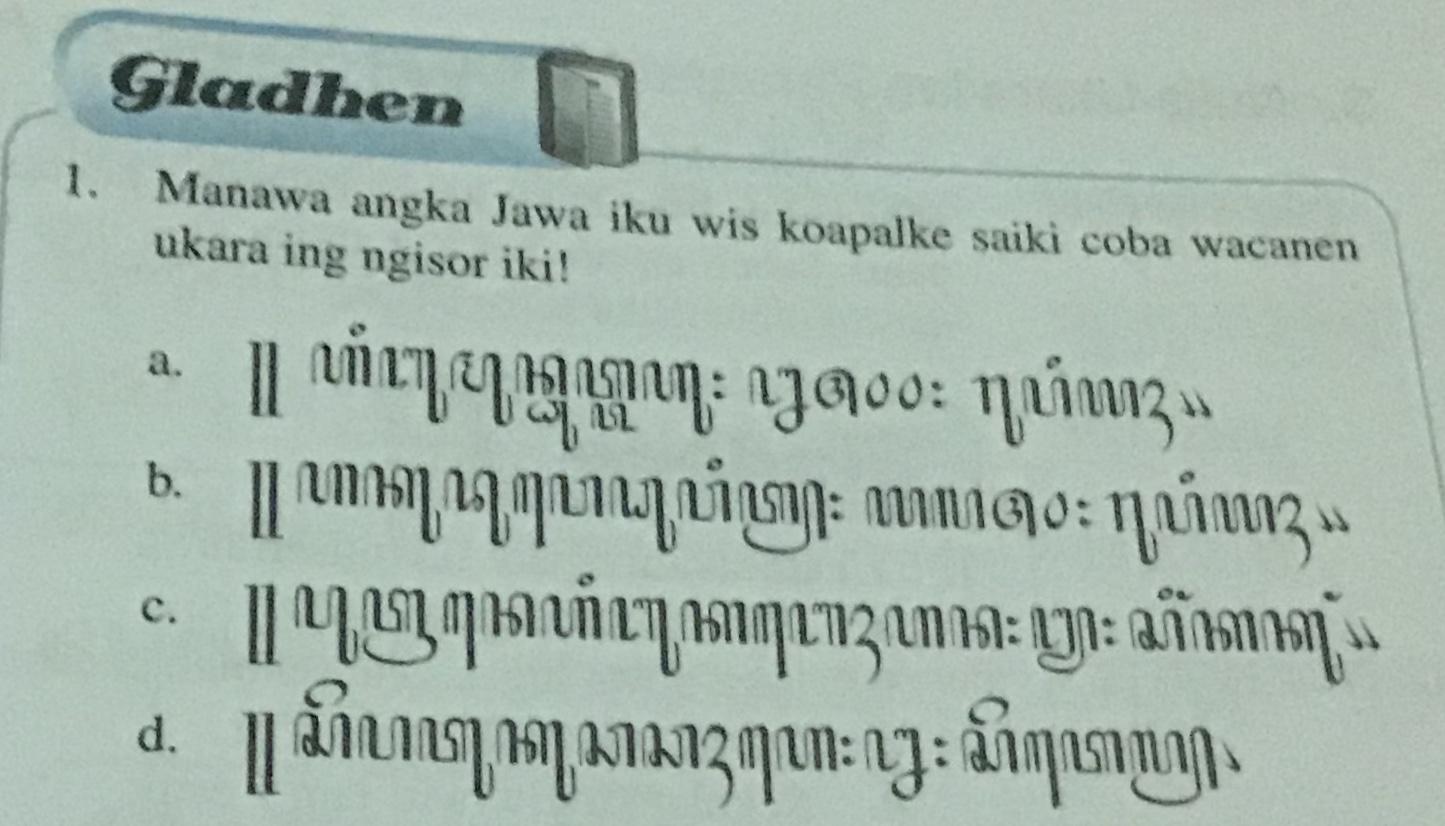 Kunci jawaban gladhen kompetensi bahasa jawa kelas 10 halaman 128 130ide kunci jawaban kirtya basa kelas 8 halaman 2 viral gladhen ulangan akhir semester genap kirtya basa kelas 7 youtube kirtya basa kelas 8 guru ilmu sosial buku sekolah kirtya basa smp mts kelas 9 ix ktsp 2013 shopee uji kompetensi wulangan 1 kirtya basa kelas 7 basa jawa. Wenehana tanda ping ( x ) ing hurup a, b, c, utawa d sangarepe wangsulan kang bener! Sep 01, 2021 · kunci jawaban lks bahasa jawa kelas 6 semester 1 2019 download soal uts bahasa indonesia kelas 6 semester 2 soal uts bahasa indonesia kelas 6 semester 2 terbaru tahun ajaran 2018 2019 kunci jawaban room i 1 b 2 a 3 d 4 c 5 c 6 b 7 b 8 a 9 a 10 c 11 b 12 c 13 a 14 b 15 a 16 c 17 d 18 c 19 a 20 c 21 b 22 b 23 d 24 a 25 d 26 c. Try the suggestions below or type a new query above. Berikut mafia online sajikan beberapa contoh soal ulangan akhir semester genap matematika kelas vii.